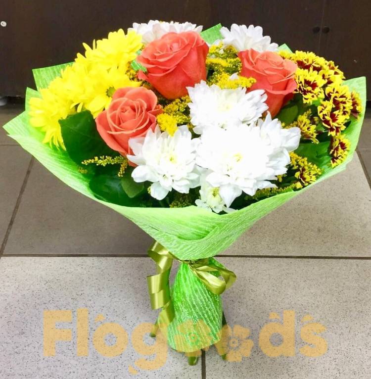 Хризантемы и розы в сочетании с зеленью, дают потрясающий вид букету. Такой букет прекрасный подарок на юбилей, День Рождение или просто так.
